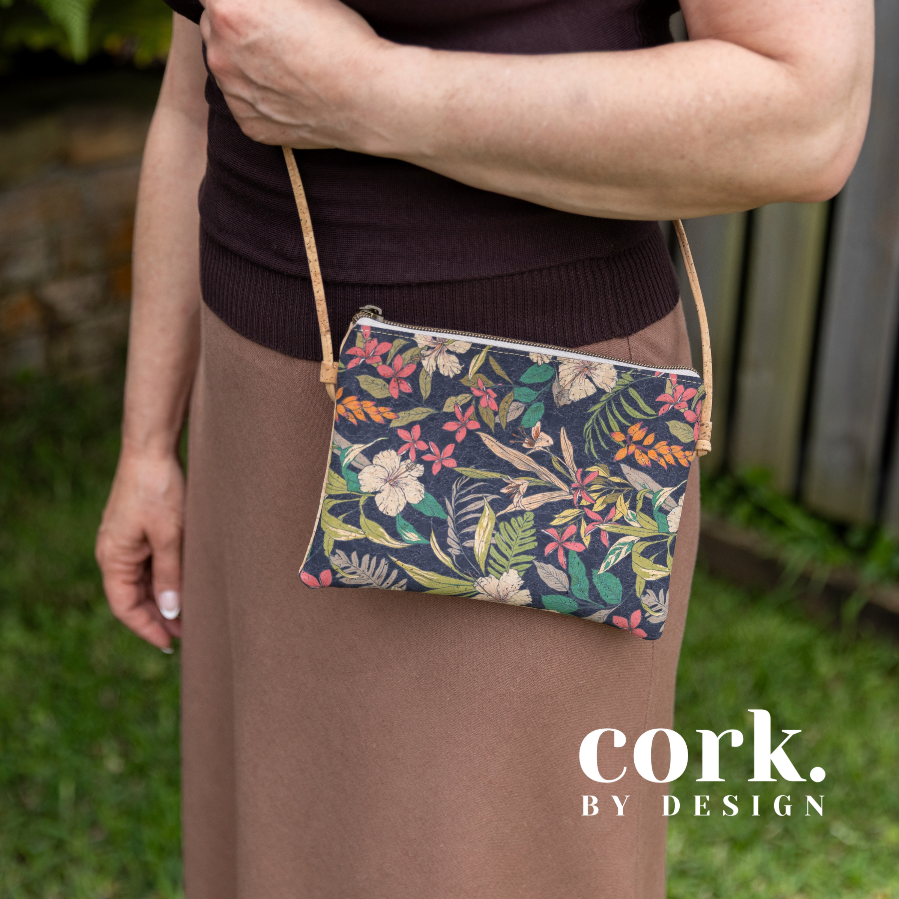 Fully lined compact crossbody bag features cork strap and zip closure. Handmade in Australia from natural Portuguese Cork.